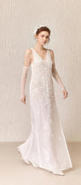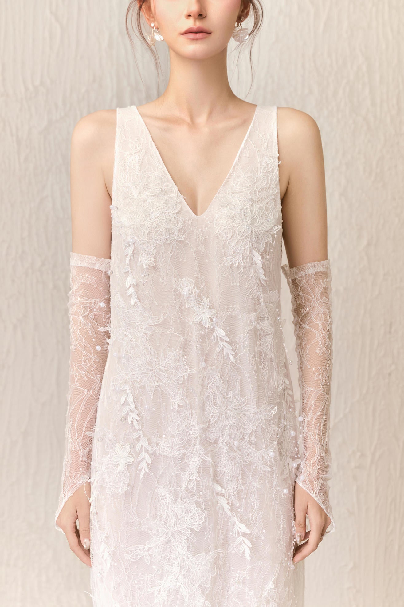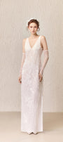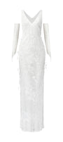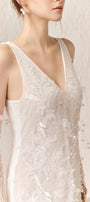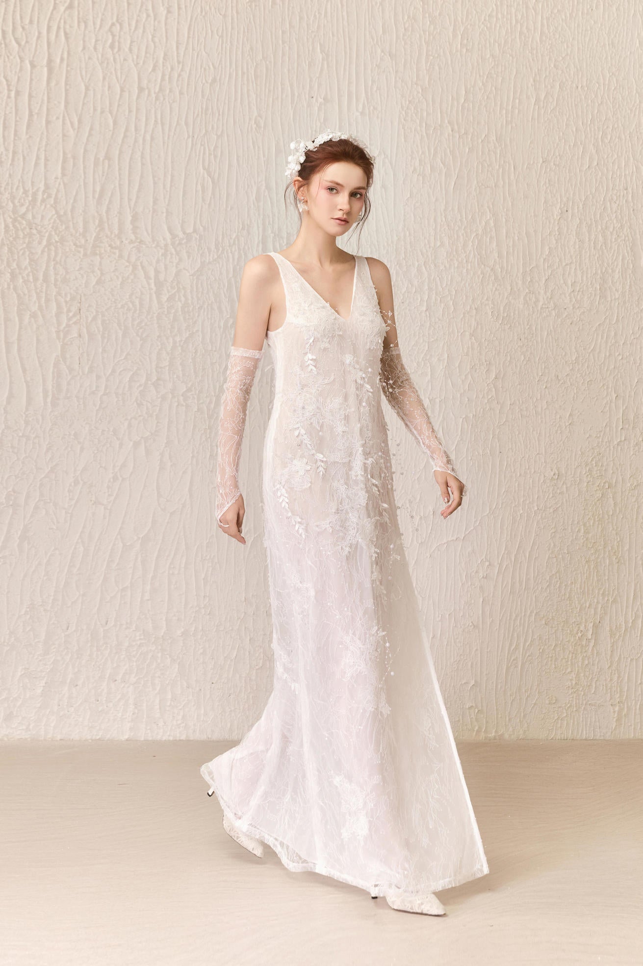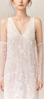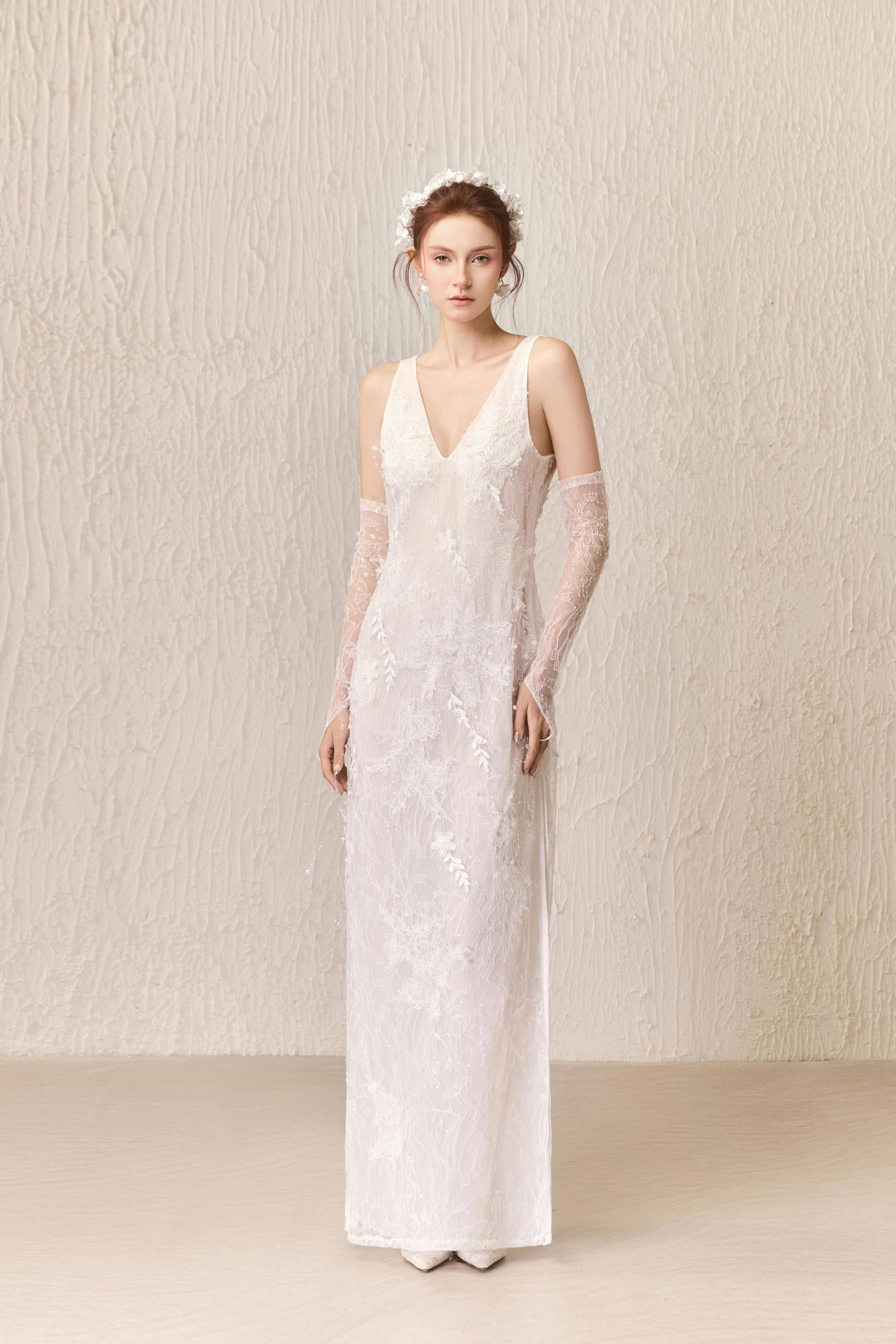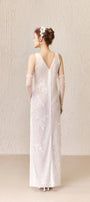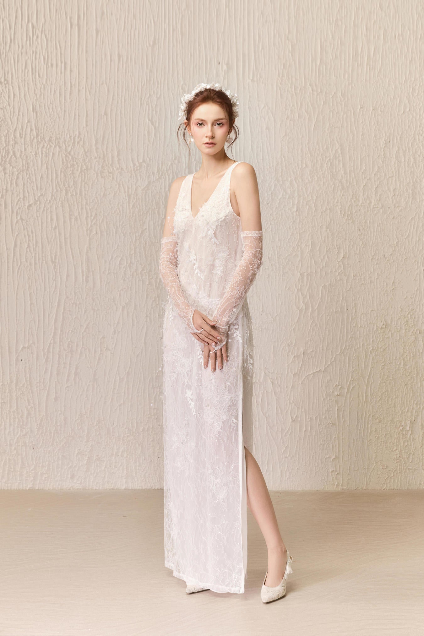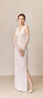 يتميز هذا الفستان بأشرطة رفيعة رفيعة وتطريزات دانتيل متقنة تُبرز أناقة تصميمه. صُمم هذا الفستان بتنورة شفافة طويلة، ليُضفي مزيجًا راقيًا من الجاذبية والأناقة، مثاليًا للمناسبات الرسمية التي تتطلب إطلالةً لافتةً وأنيقةً في آنٍ واحد.