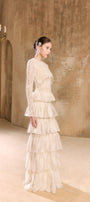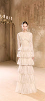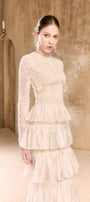 This dress features a trumpet silhouette and a circle neckline, providing a stylish and elegant look for any occasion. The delicate floral lace and ruffles adds a touch of femininity to this dress, making it a perfect choice for a romantic evening out or a special event.