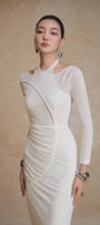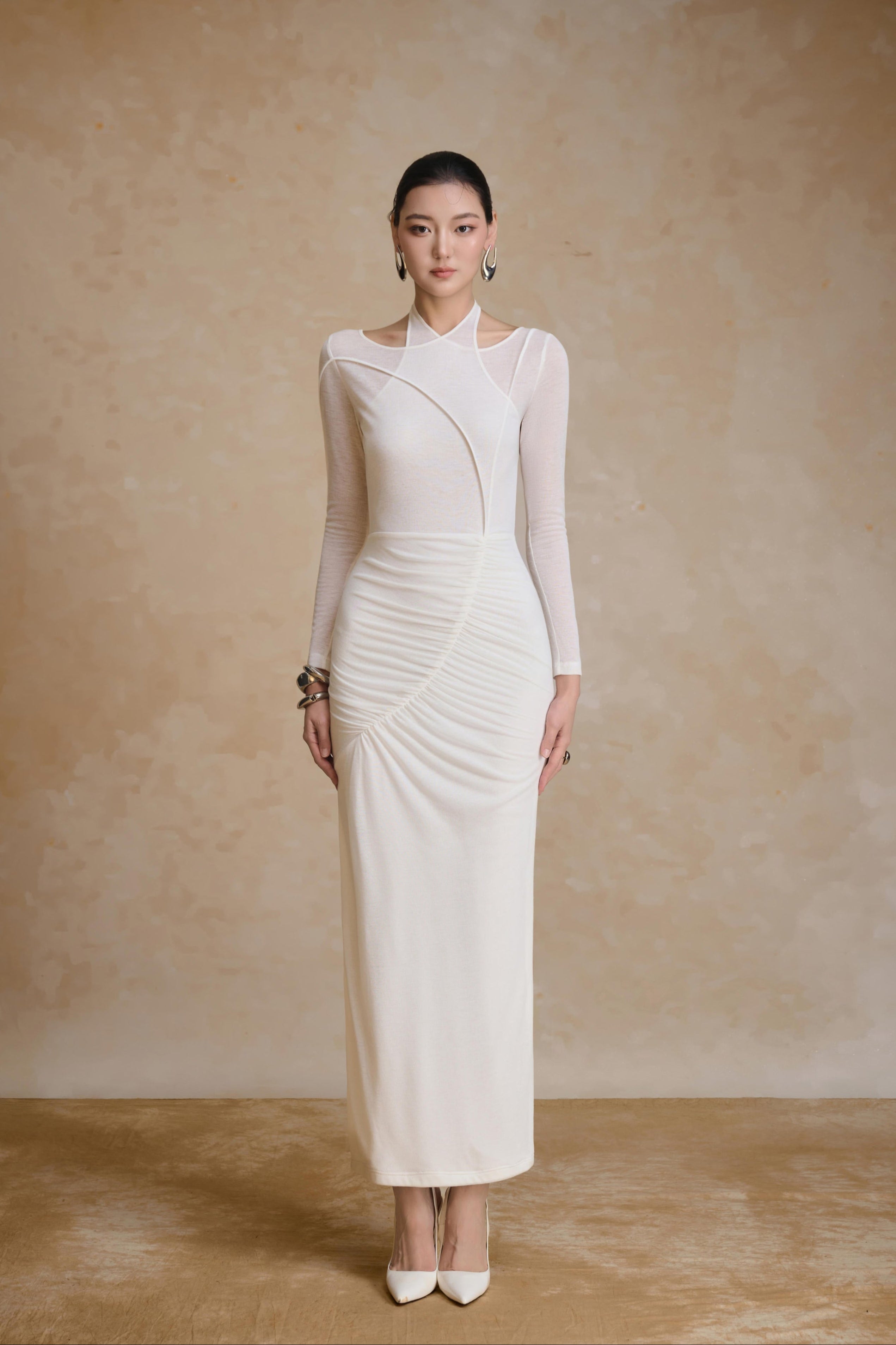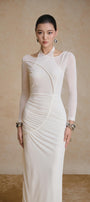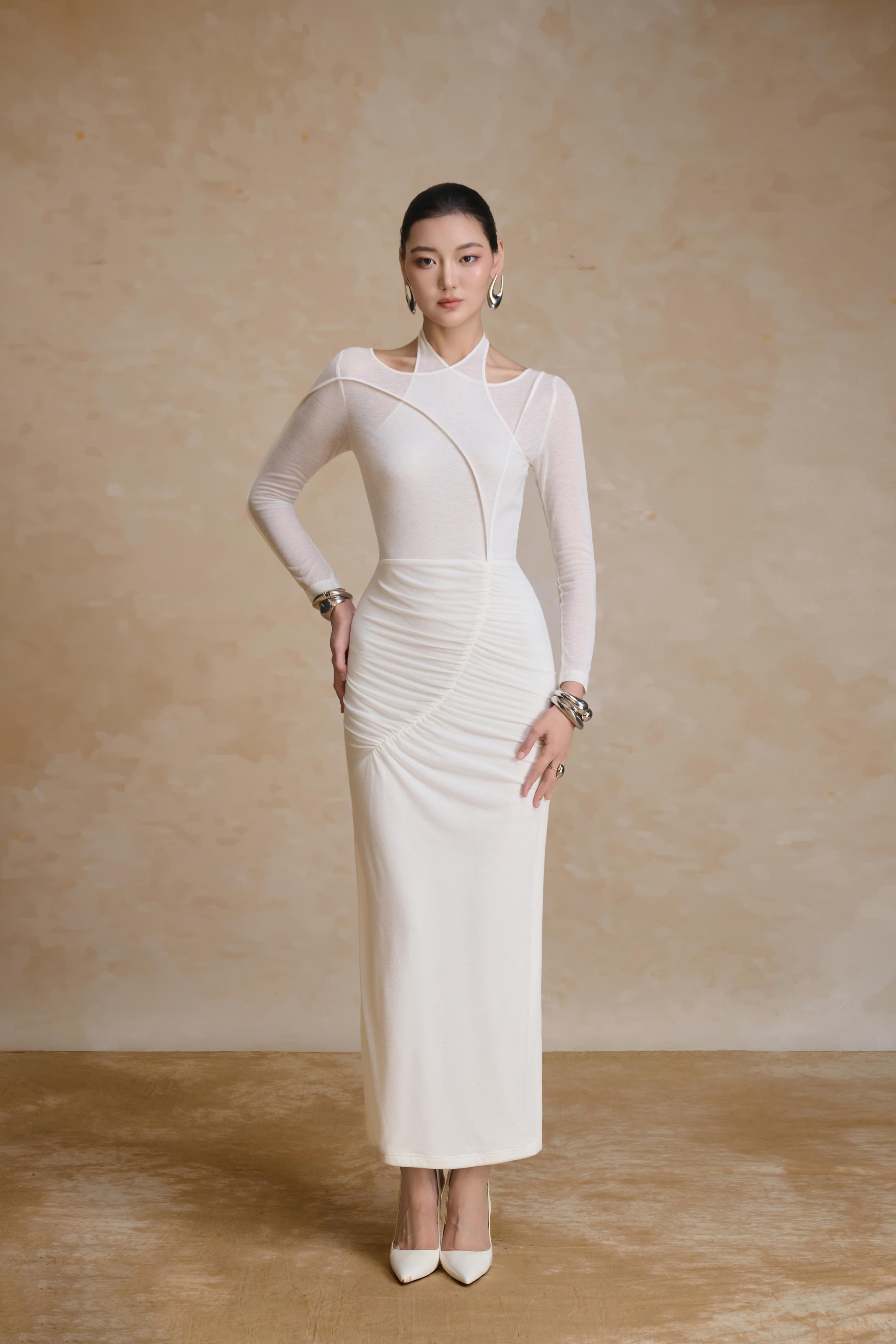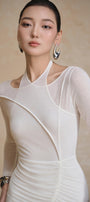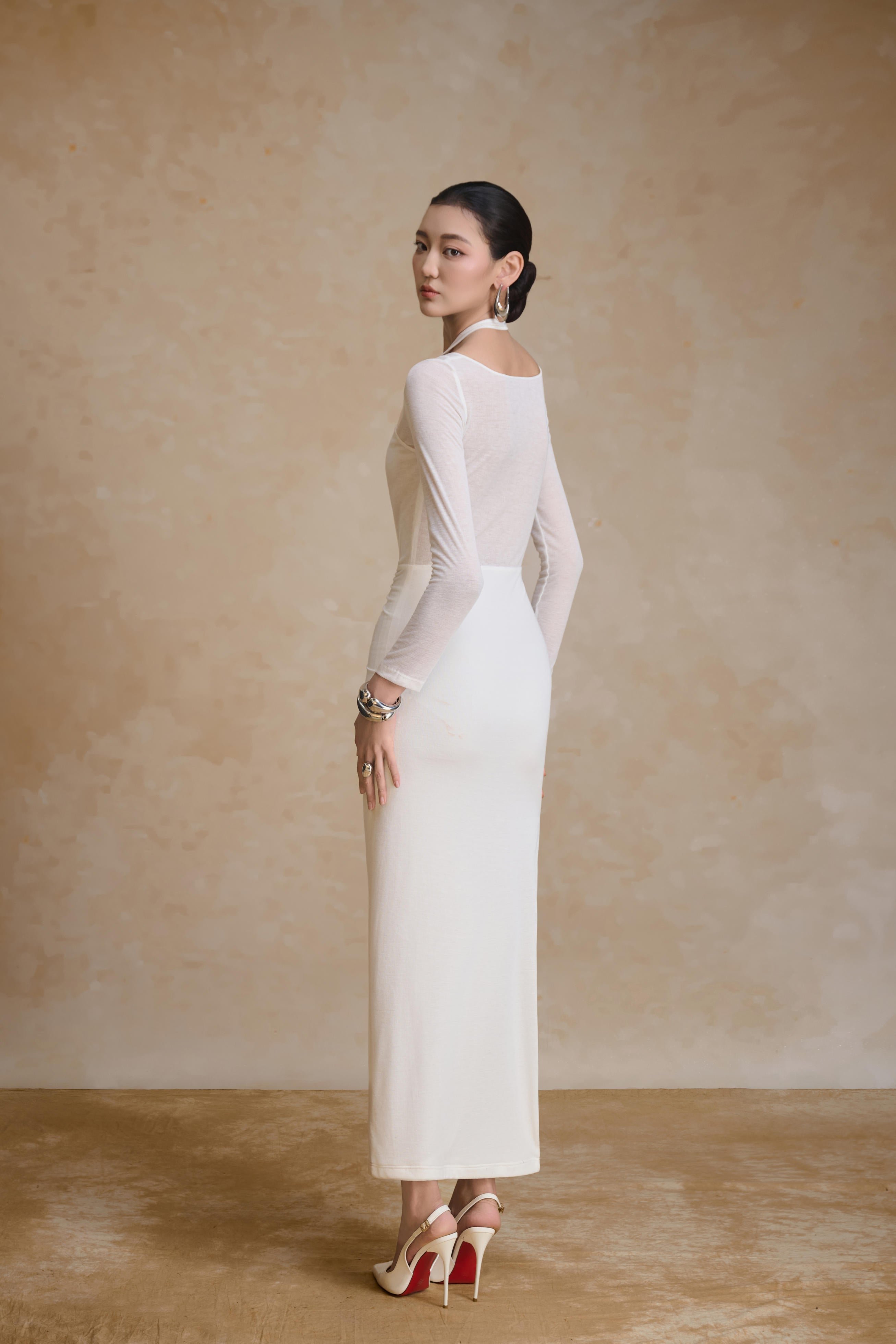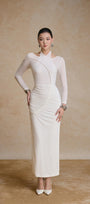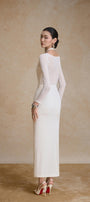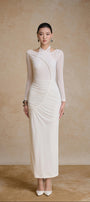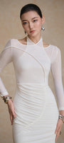 فستان دانتيل ضيق بفتحة رقبة أنيقة، مزين برباط من الحرير من الخلف. بلون وردي فاتح جذاب، ينضح بالأنوثة والرقي والجاذبية.