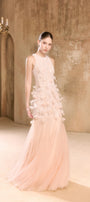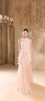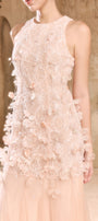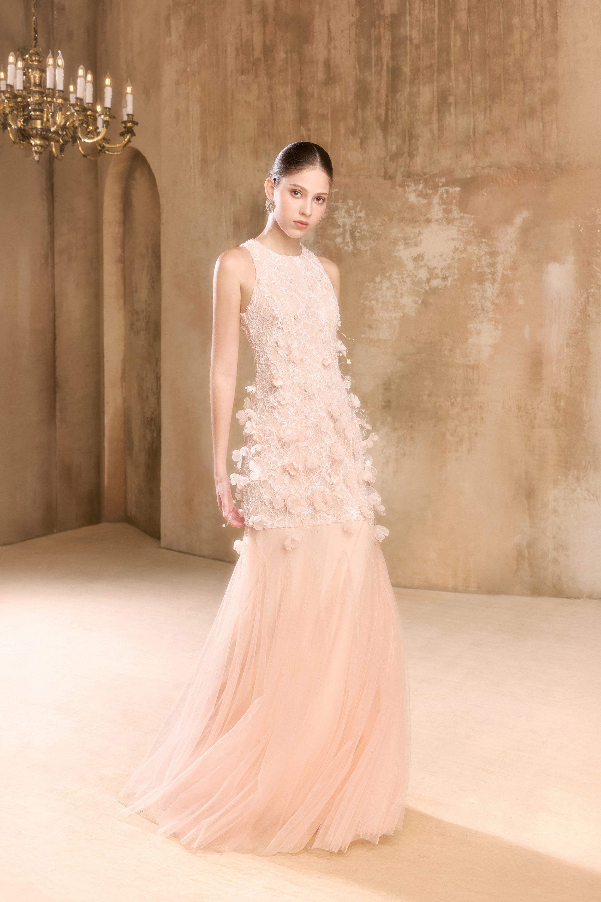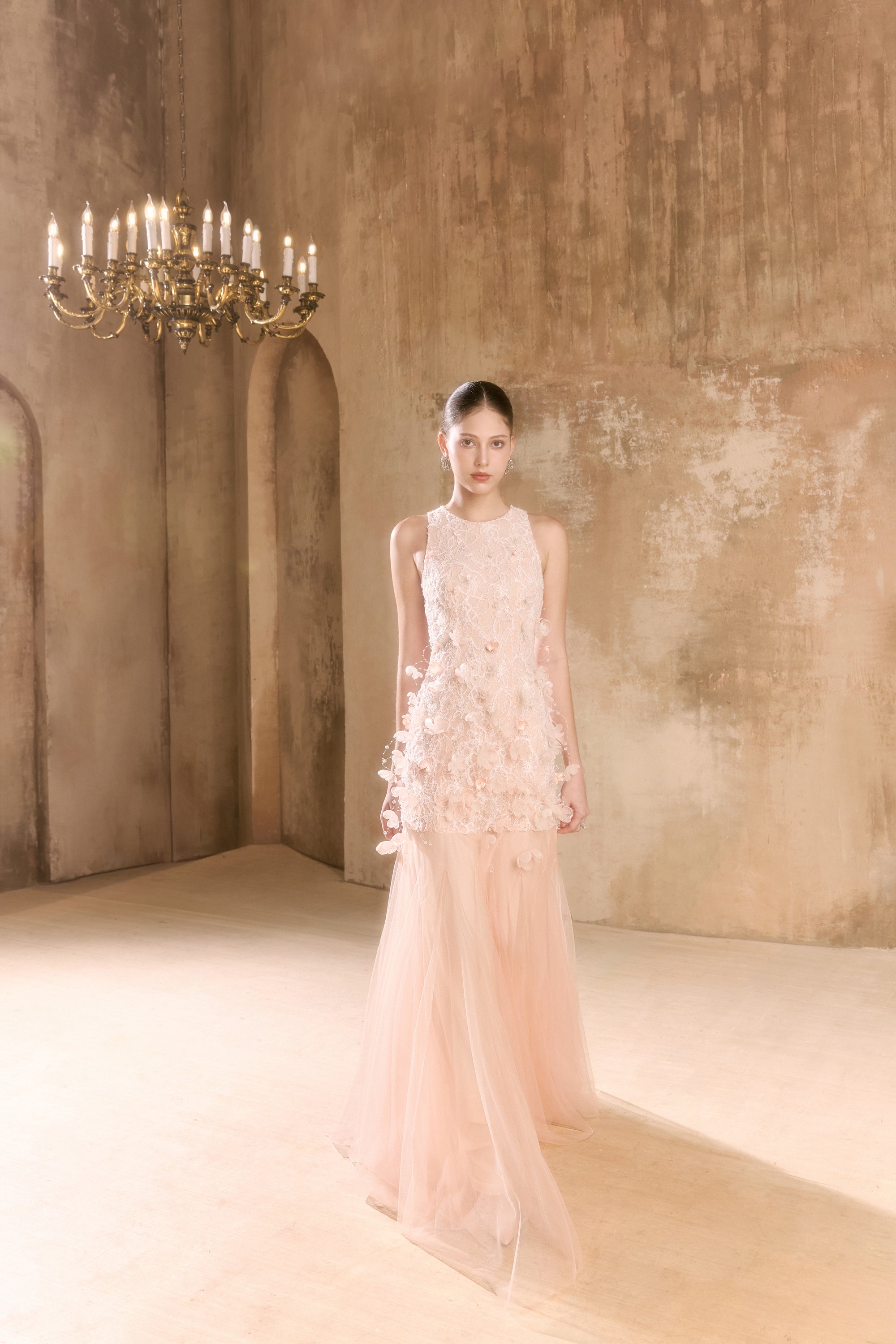 A fitted dress made of lace fabric, with tulle fabric in multiple pieces to create a wide, flowing, and airy silhouette, transparent and romantic. Hundreds of flowers and beads are hand-stitched, fluttering with every movement of the body.