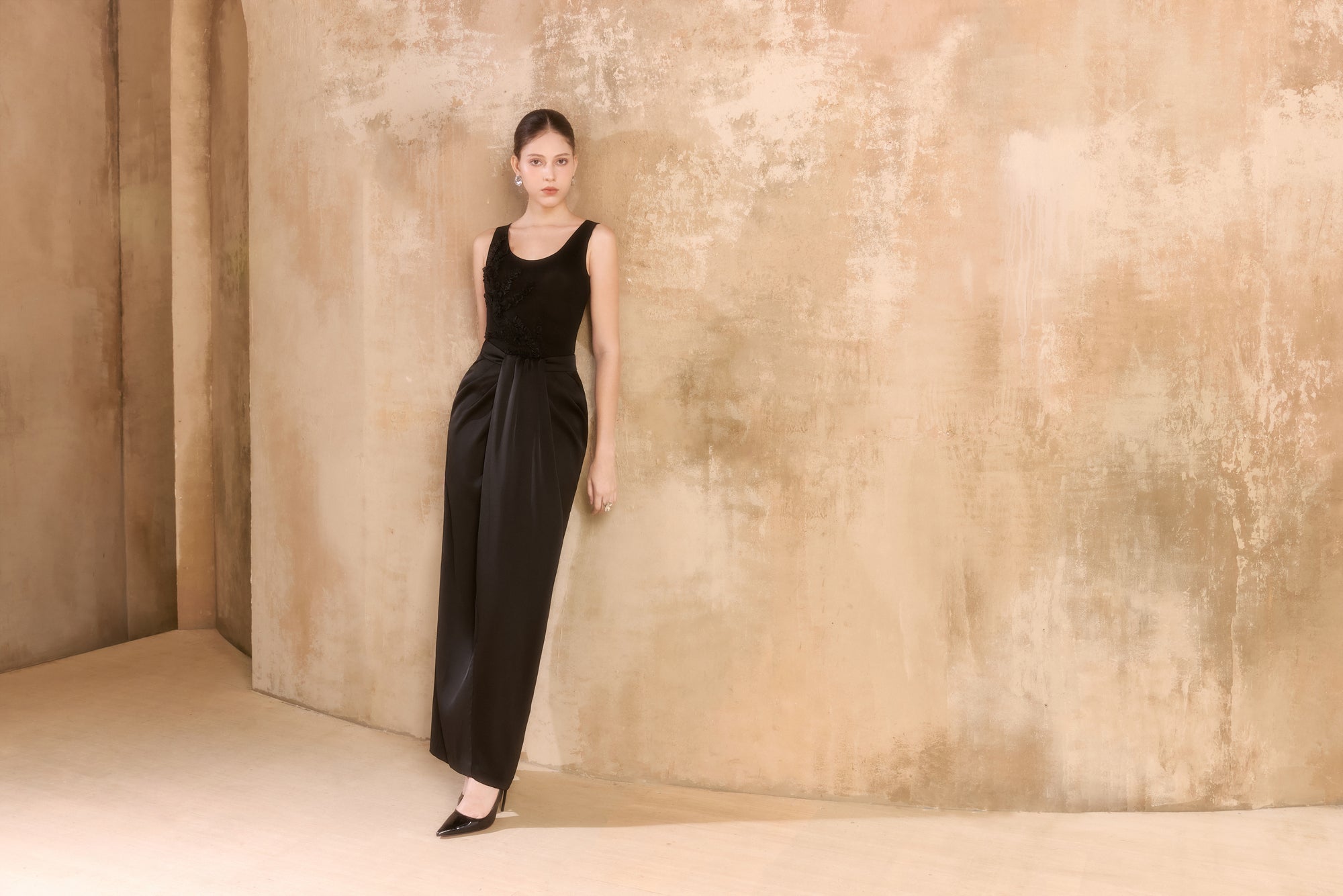 Skirt with sarong design, sophistication. The dress is designed to flatter your figure