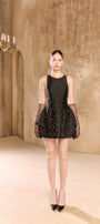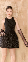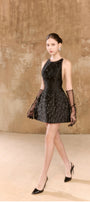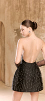 Little black dress with a halter neckline, back made of tulle , puffed hips to enhance the figure, hand-embroidered ombre fringes, gently swaying with every movement.