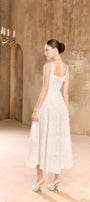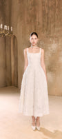 This elegant midi dress features a jacquard fabric that creates a gathered effect. The strappy neckline adds a subtle touch of sophistication while accentuating the shoulders. Perfect for special occasions, this dress offers timeless style with a modern twist.