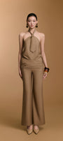 بلوزة هالتر بفتحة رقبة أنيقة، مزينة بأزرار مزخرفة لإضفاء لمسة راقية. تصميم الظهر المتقاطع يضفي عليها لمسة فريدة، ما يجعلها عصرية وأنيقة في آن واحد. تصميمها متعدد الاستخدامات يسمح بارتدائها بمفردها أو مع جاكيت لإطلالة أنيقة.