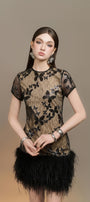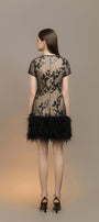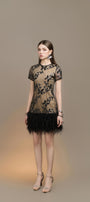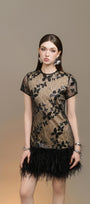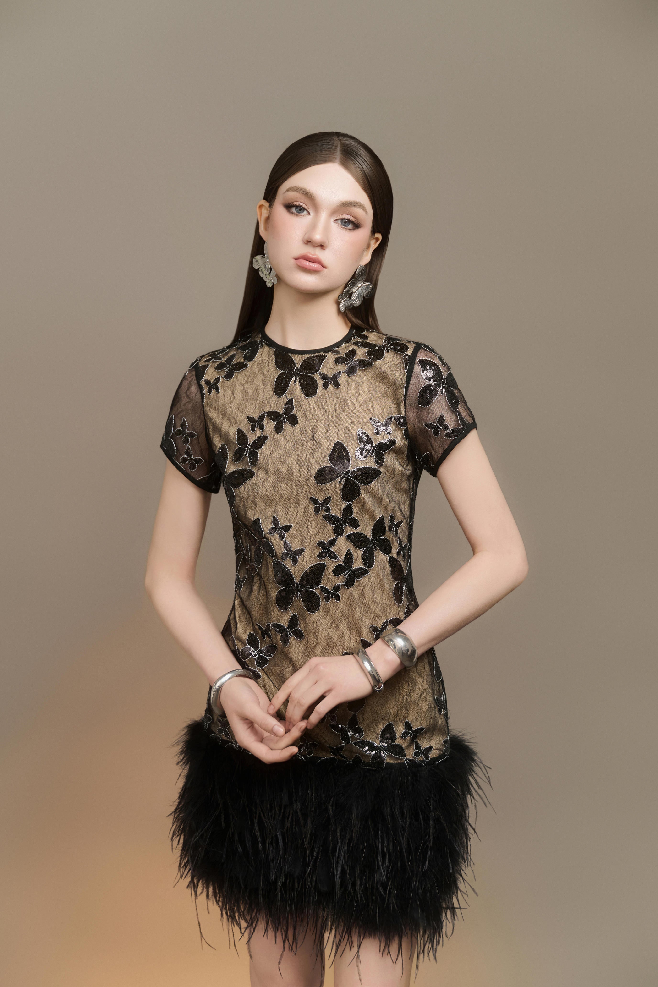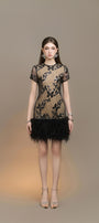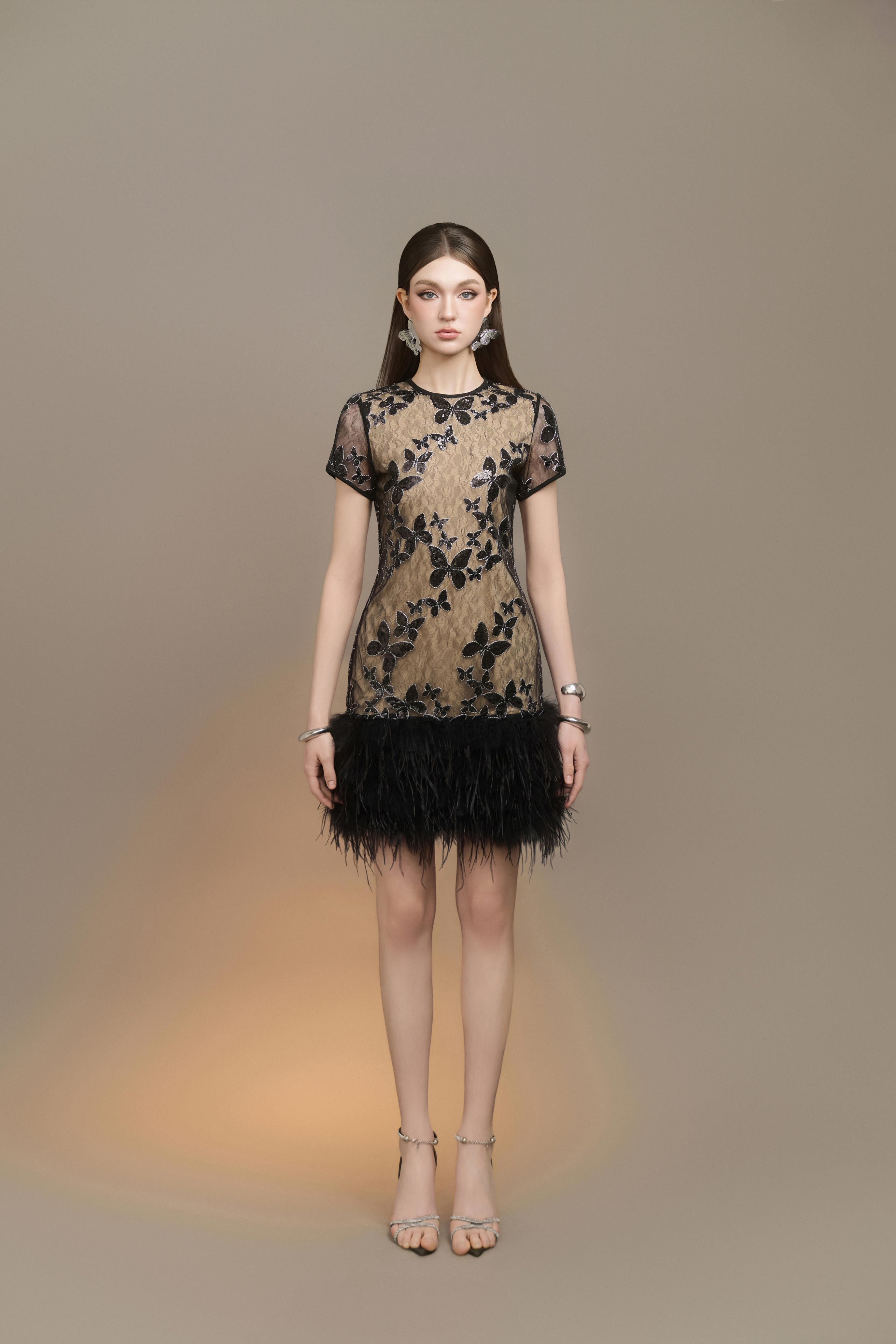 يُبرز هذا الفستان القصير تطريزًا متقنًا على شكل فراشة، مُزدانًا بتفاصيل من الريش على التنورة السفلية. يُعزز هذا المزيج ملمس الفستان وجاذبيته البصرية، مُقدمًا تصميمًا أنيقًا وحيويًا. صُمم قماش التول وقصته الضيقة بحرفية عالية، ليمنحكِ مظهرًا أنيقًا مثاليًا للمناسبات الأنيقة.