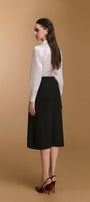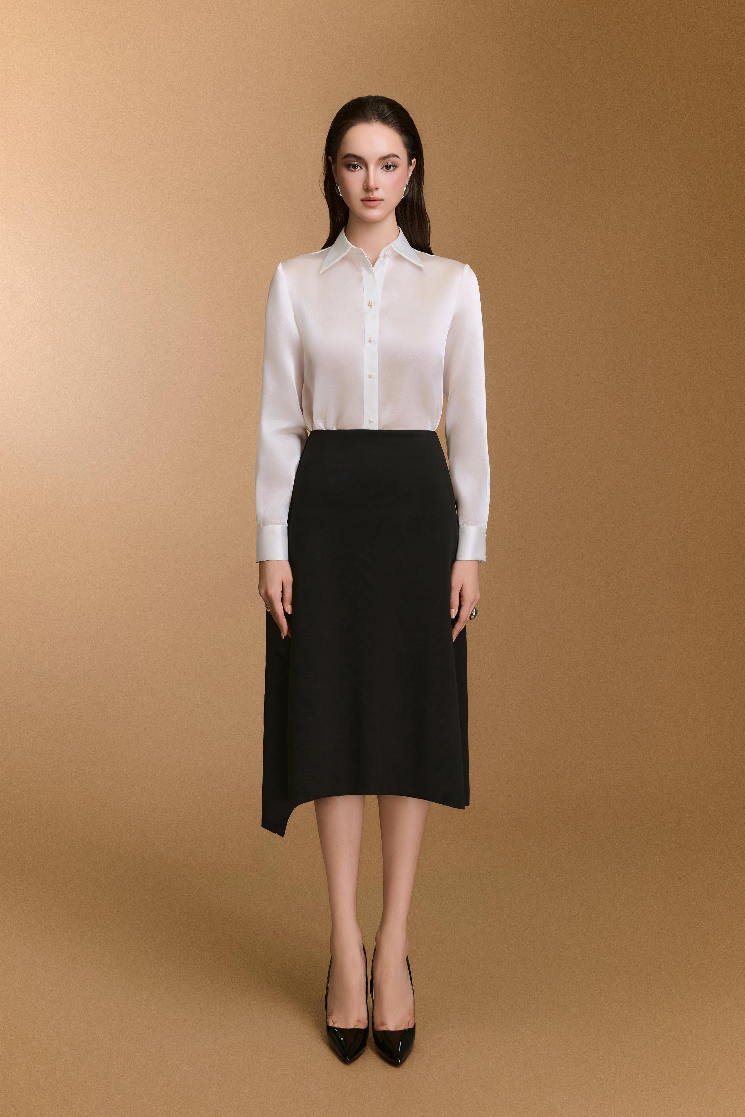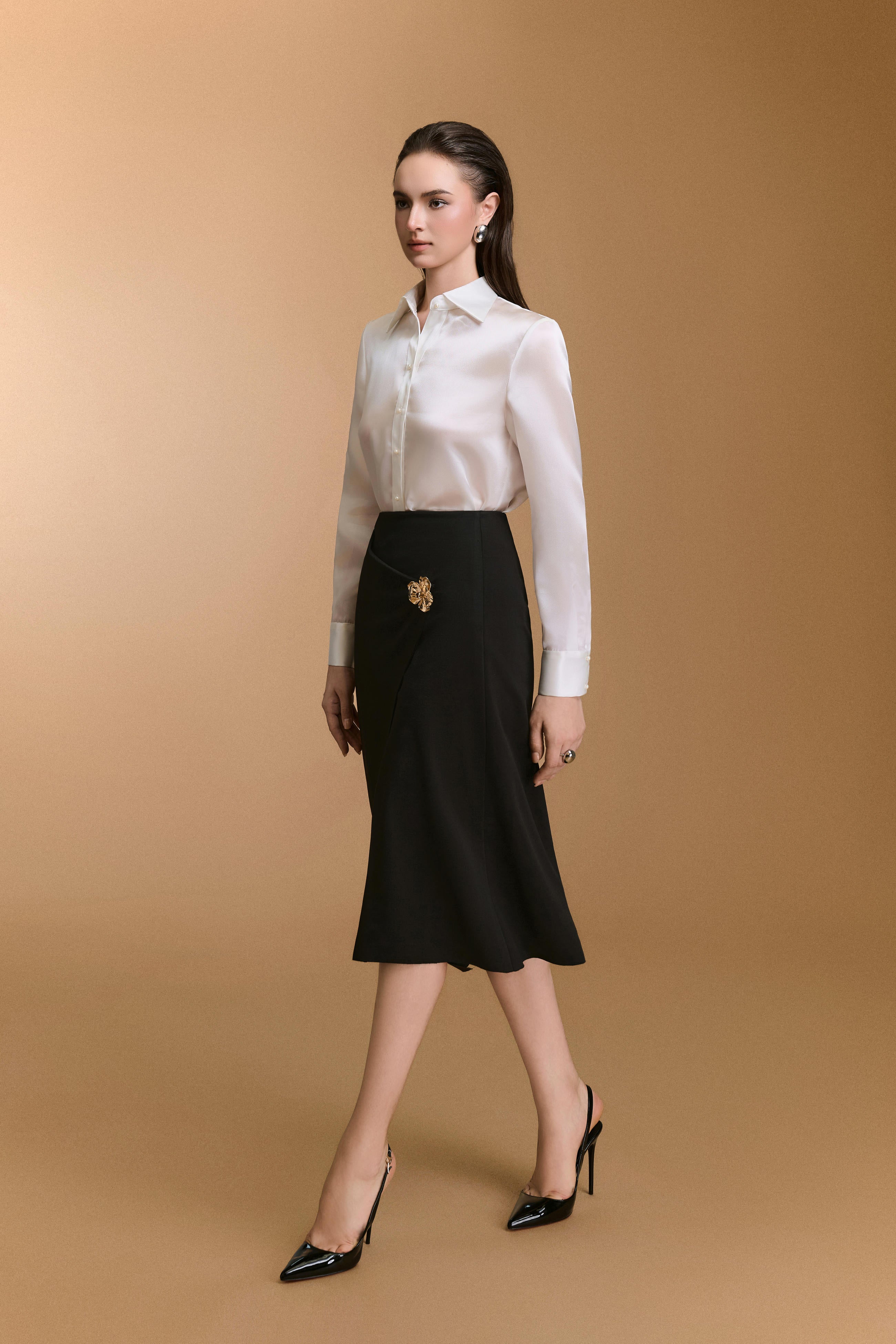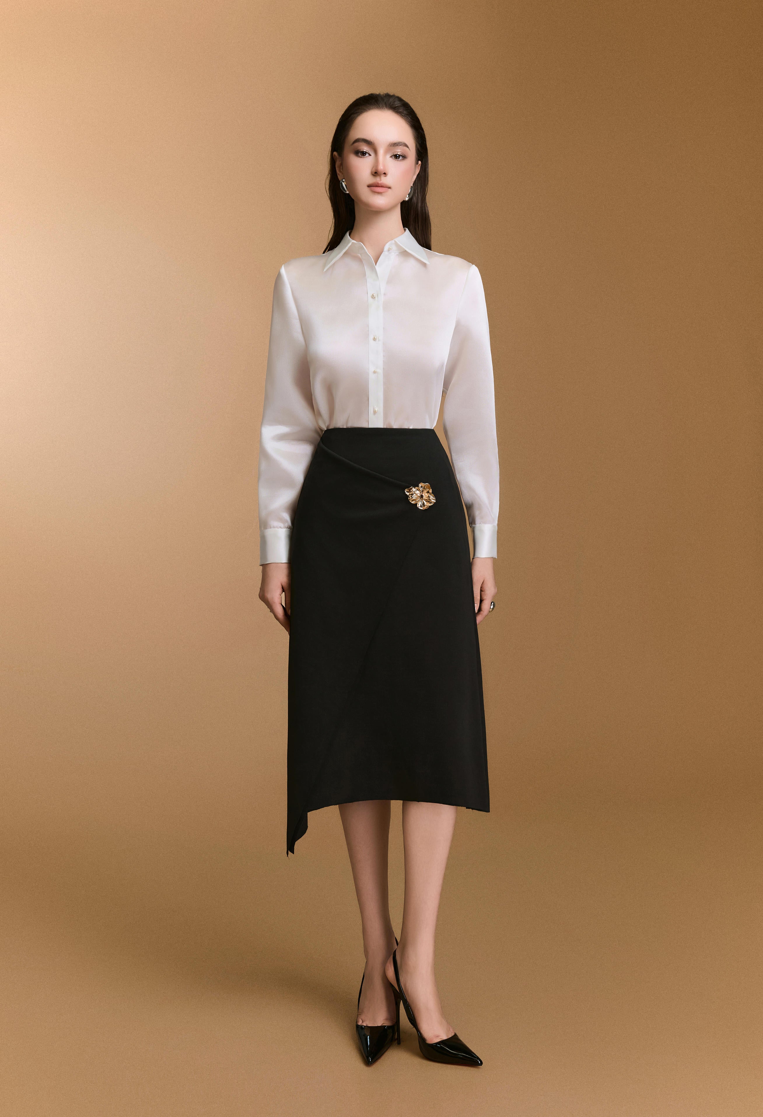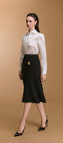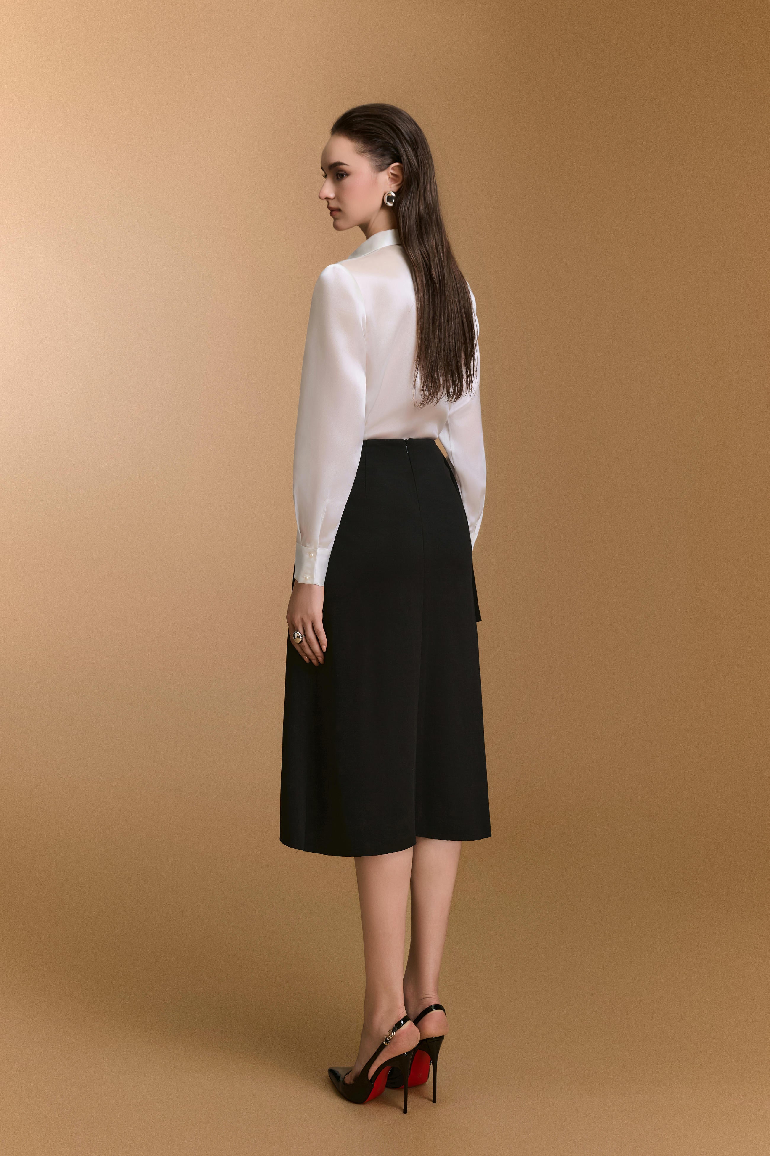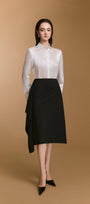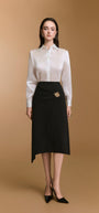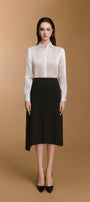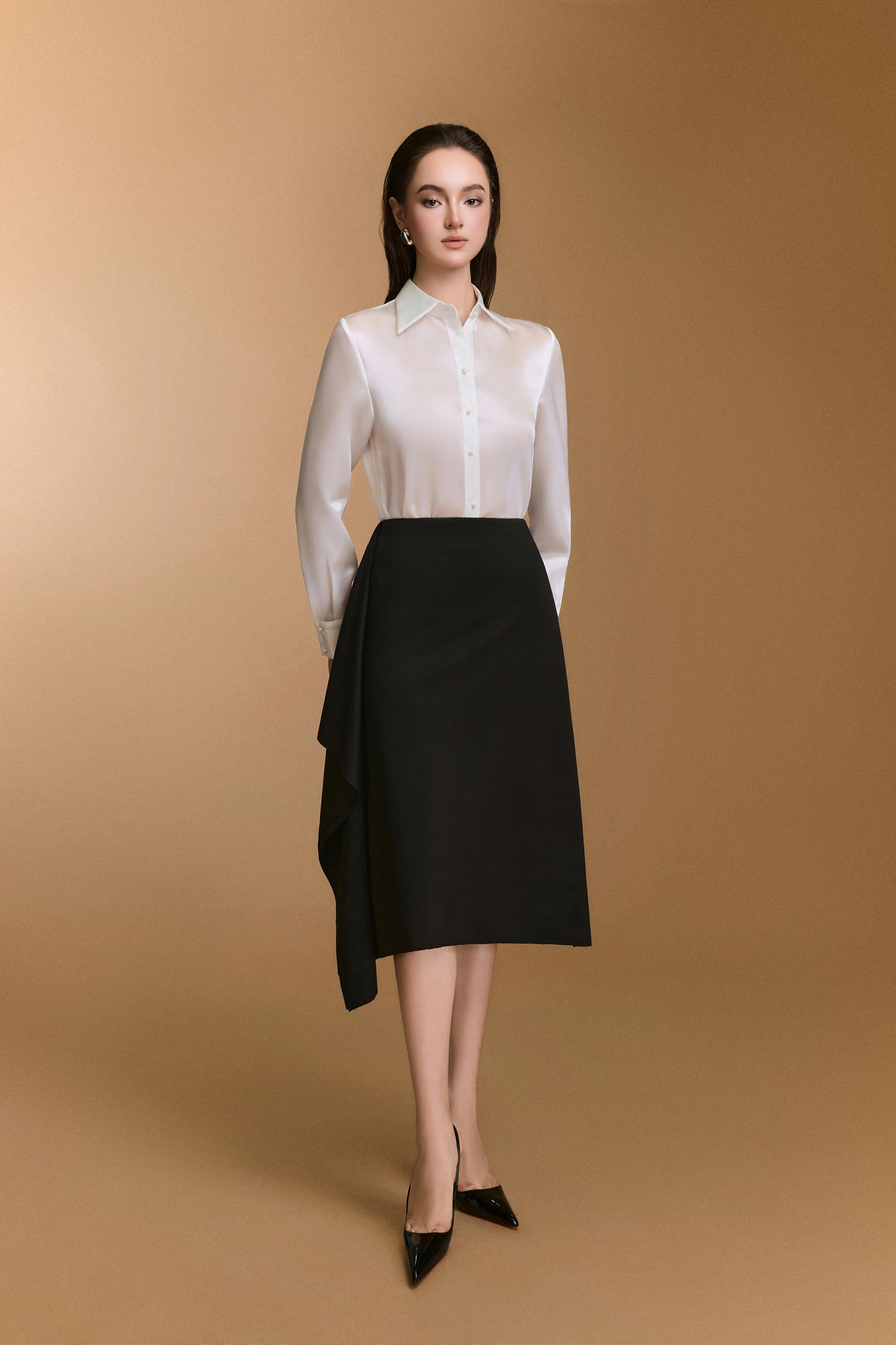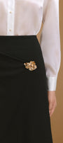 تنورة بقصة A بجزء ناعم منسدل، يمكن تثبيتها بدبابيس لتتحول إلى تنورة أنيقة بقصة قلم رصاص. يجمع هذا التصميم متعدد الاستخدامات بين الأنوثة والرقي العصري، مما يتيح لكِ الانتقال بسلاسة بين إطلالاتكِ المختلفة.