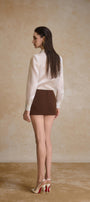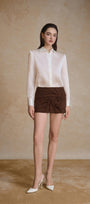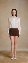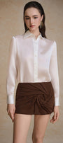 قميص كلاسيكي بتصميم جديد، بياقة مسطحة عصرية، مصنوع من الأورجانزا الفاخرة بلون أبيض بورسلين ناعم ولمسة لؤلؤية رقيقة. تصميمه المهيكل يُضفي لمسة من الرقي والحداثة.