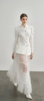 مصنوعة من قماش دانتيل شفاف عالي الجودة. هذه التنورة الطويلة مثالية لأي مناسبة رسمية أو سهرة في المدينة. تألقي بلمسة من الأناقة.