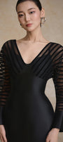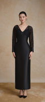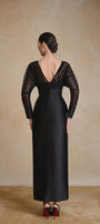 فستان ضيق مصنوع من قماش التفتا والشبك، مزين بتطريز يدوي دقيق من خيوط المخمل. يُبرز التصميم قوام الفستان بأناقة راقية وجاذبية مميزة.