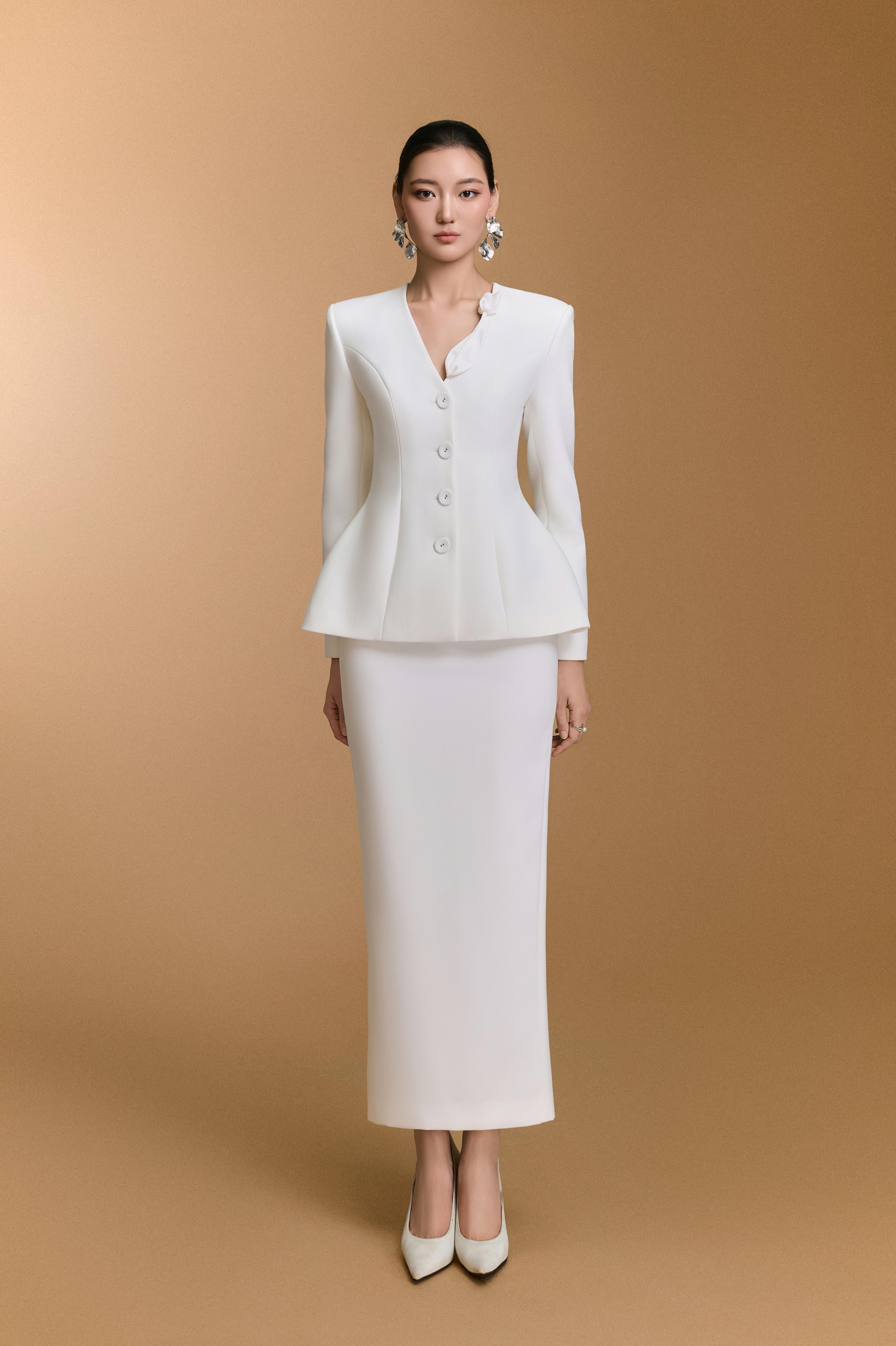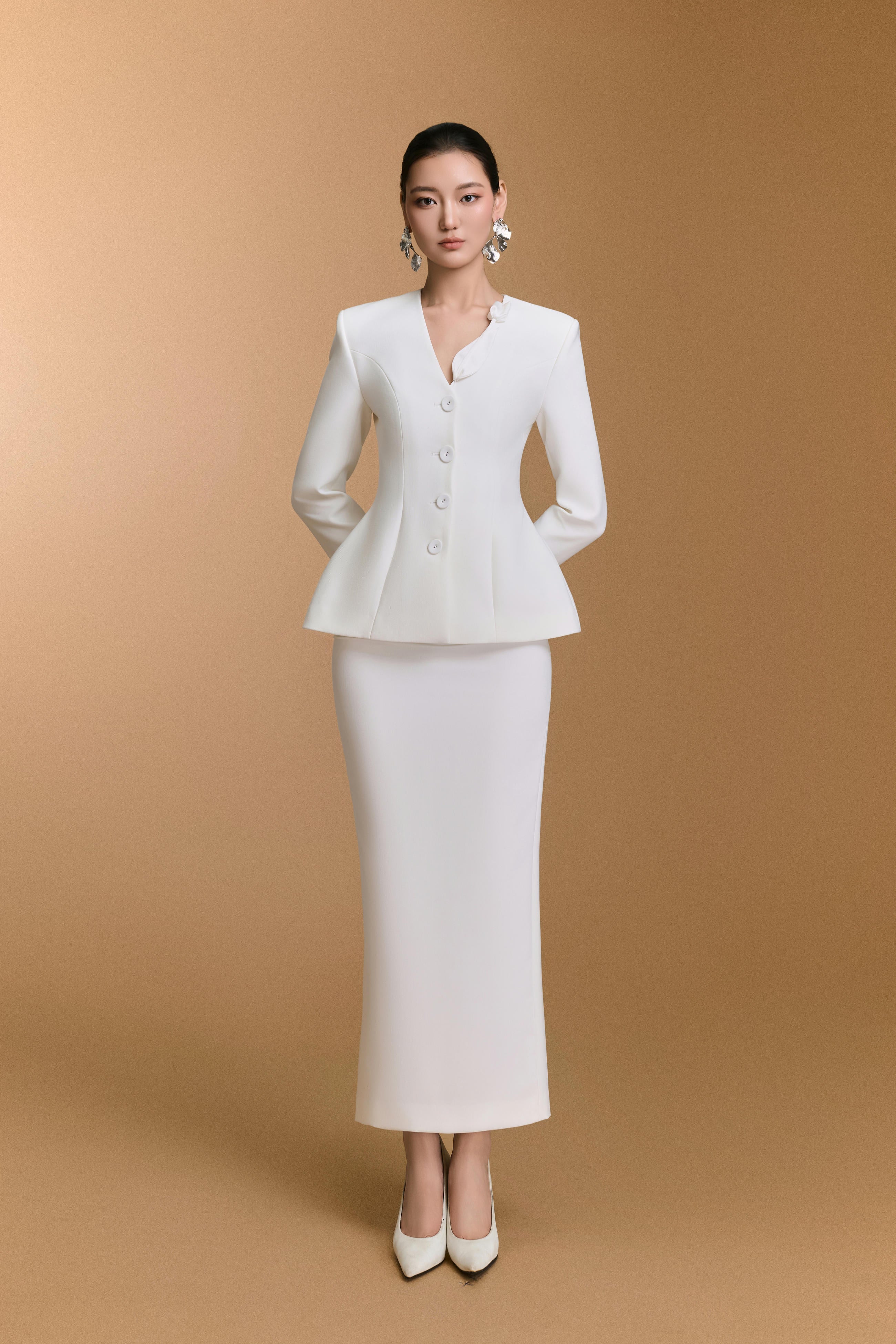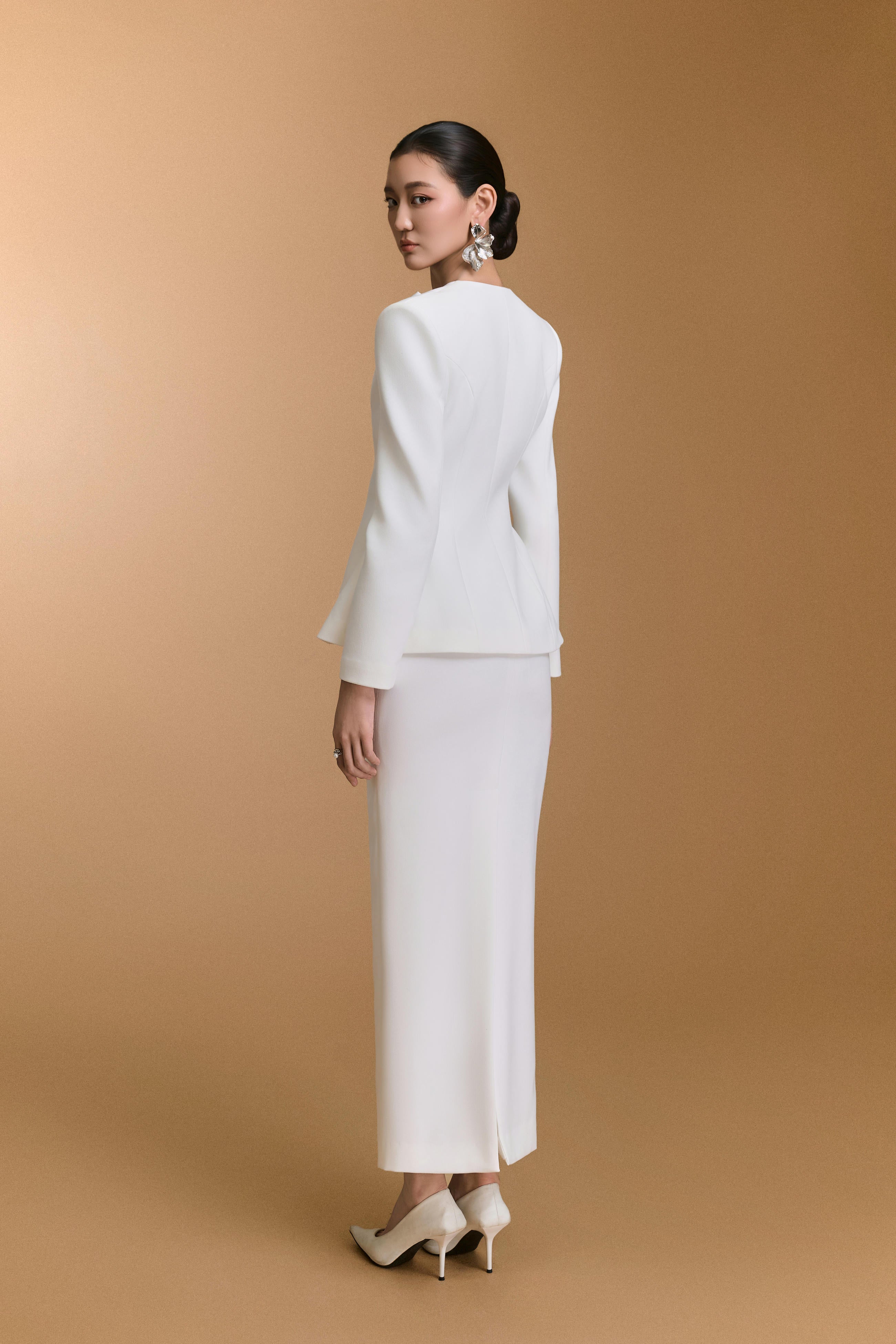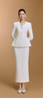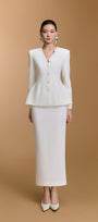 تنورة ضيقة مصنوعة من قماش شبكي، مزينة بزخارف تطبيقية دقيقة، ومبطنة بقماش هابوتاي ناعم. تصميمها الأنيق يُبرز قوامها ويمنحها أناقة راقية. مناسبة للمناسبات الرسمية، واجتماعات العمل، والمناسبات المهنية.