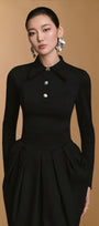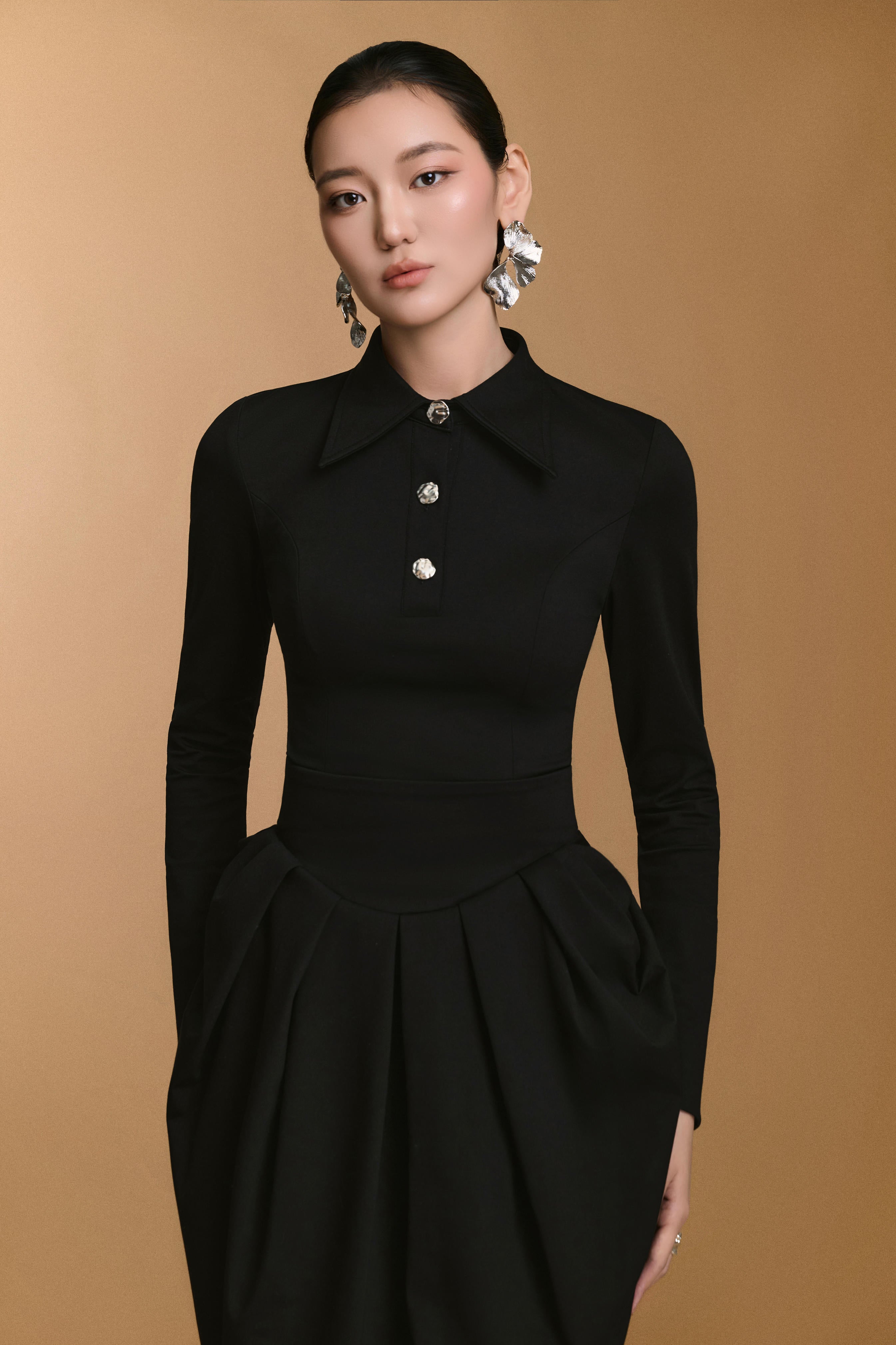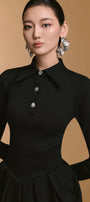 قميص ملائم بياقة كلاسيكية مدببة، مزين بأزرار معدنية وفتحات أكمام عالية. مصنوع من النيوبرين المكشكش، يوفر راحة فائقة مع الحفاظ على تصميم أنيق يُبرز جمال قوامك بلمسة عصرية راقية.