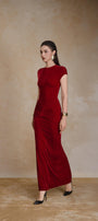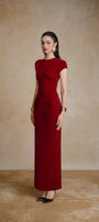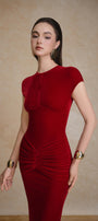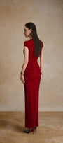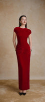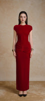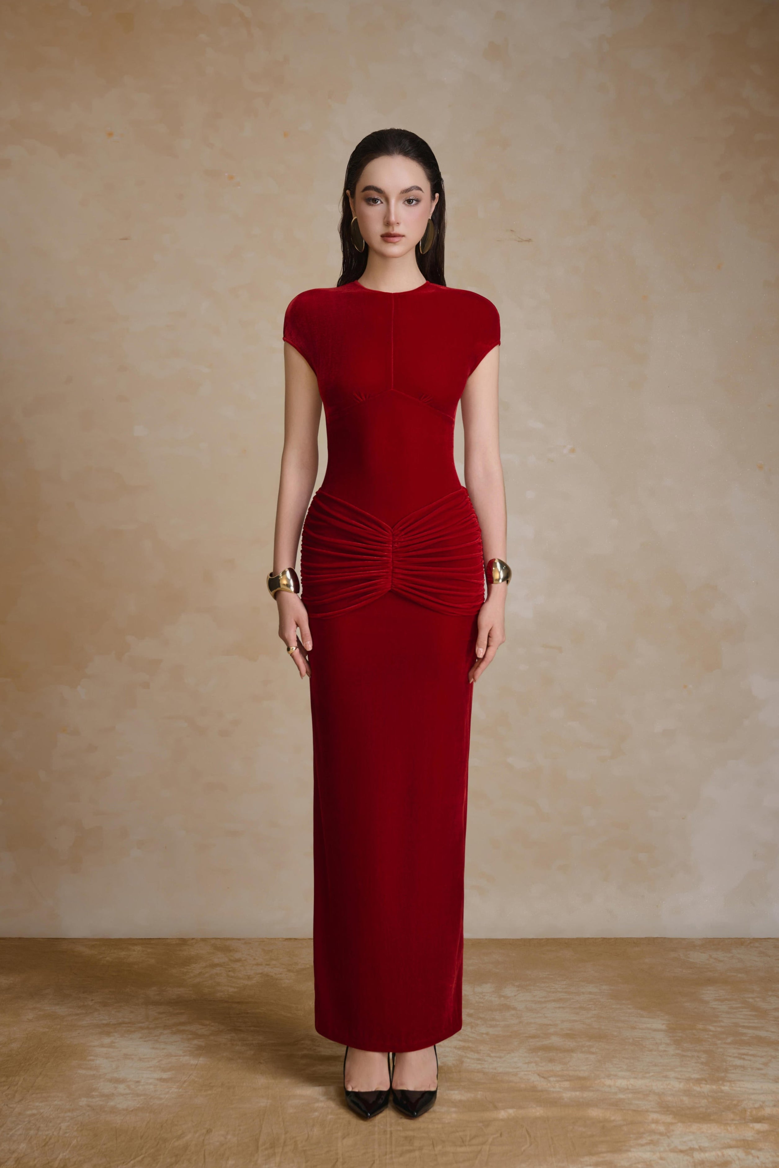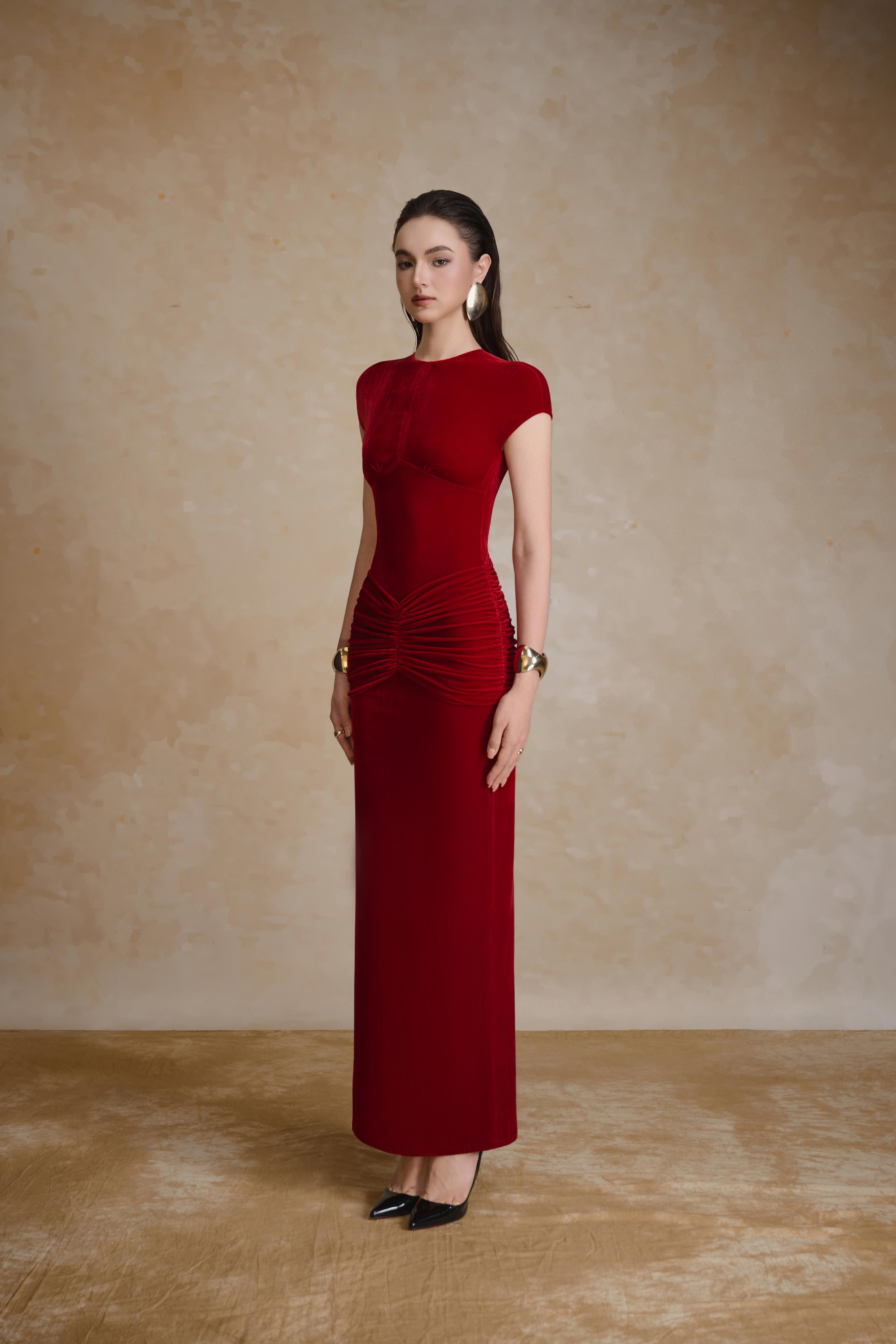 فستان ضيق بقصة أسفل الصدر، وأكتاف ممتدة، وتفاصيل كشكشة عند الوركين تُبرز جمال الخصر. مصنوع من مخمل أحمر لامع، يُشعّ رقيًا وإثارةً وجاذبيةً خالدة.