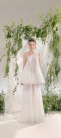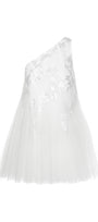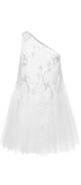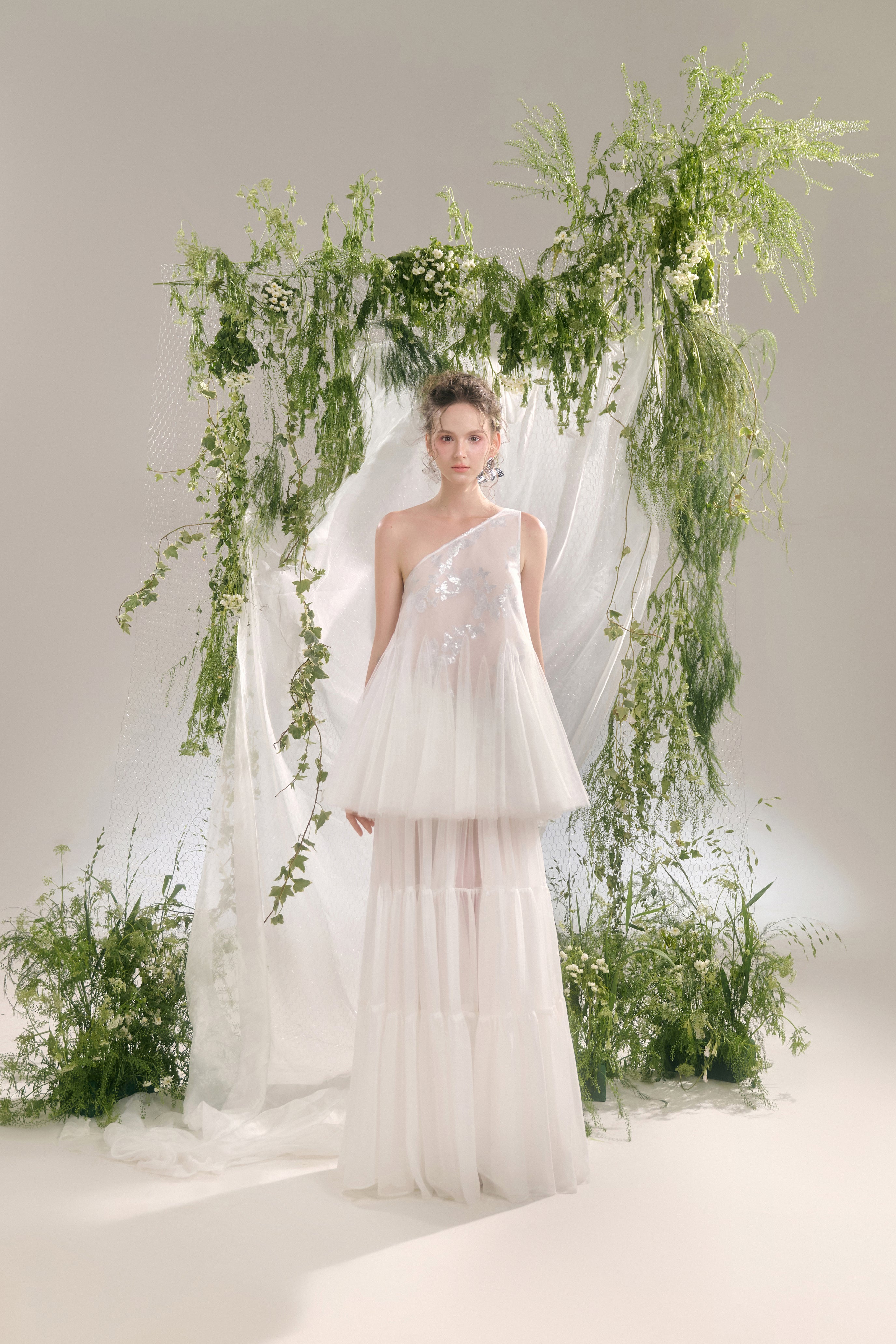 - فستان قصير غير متماثل مزين بدانتيل فراشة فضي لامع، ومغطى بثلاث طبقات من الشبكة المصنوعة من أكثر من 100 قطعة مجمعة للحصول على صورة ظلية ضخمة وخفيفة.