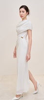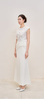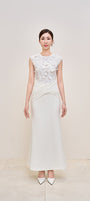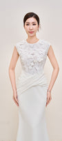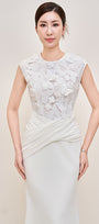 Crafted in refined cotton with delicate 3D lace appliqué, this dress exudes understated elegance. The draped waistline subtly enhances the silhouette, while the intricate floral detailing adds a touch of timeless sophistication.