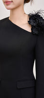 Kim Vest – Asymmetric V-neck blazer lined with silk, featuring a handcrafted floral and feather embellishment at the back for an elegant, couture finish.